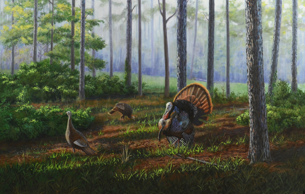 A gobbler with hens in an early morning South Carolina setting is the subject of this large painting commissioned by a delightful couple.